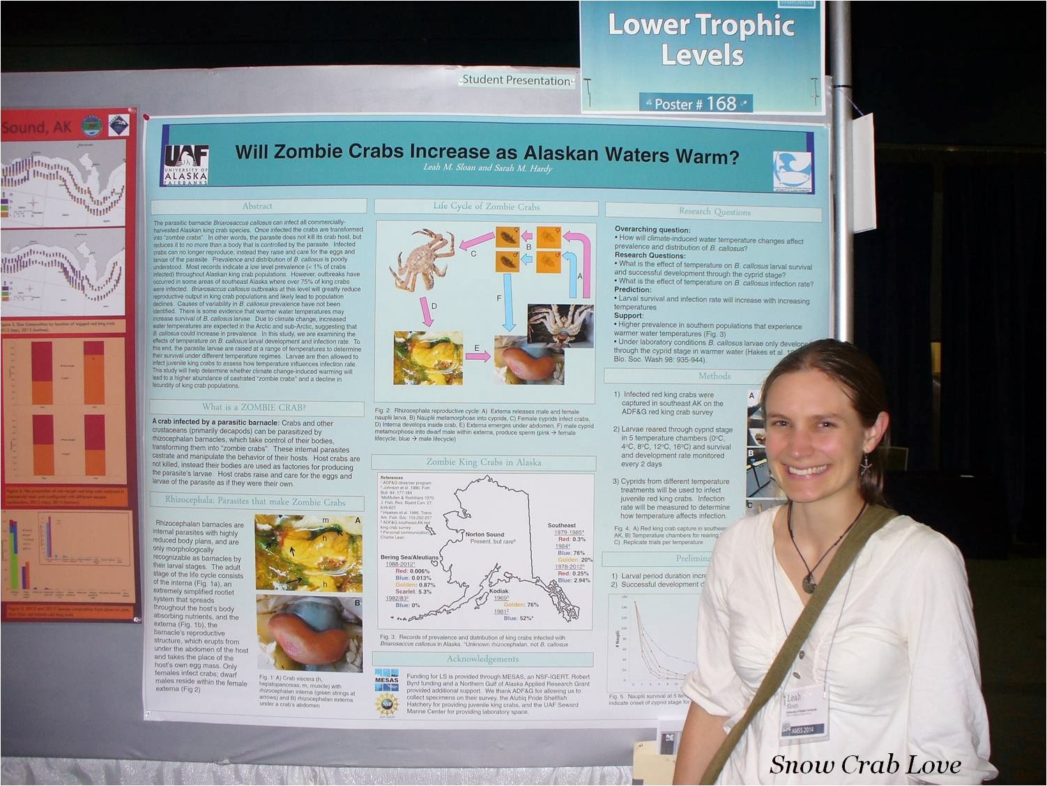 Last but not least, I learned about ZOMBIE CRABS!!! (No, not these zombie crabs.) Leah Sloan, a UAF grad student, is looking at the distribution of that nasty parasite, the rhizocephalan, and how it may be affected by temperature. The infected king crabs she's studying are referred to as 'zombie crabs' because their bodies have basically been hijacked by the parasite to be a walking, eating, parasite-brooding machine! She's answering her temperature question by exposing larval rhizocephalans (aka parasitic barnacles) to different temperatures and tracking their survival. I'll interview her soon for an "Ask a Grad Student" post so we can all learn more.